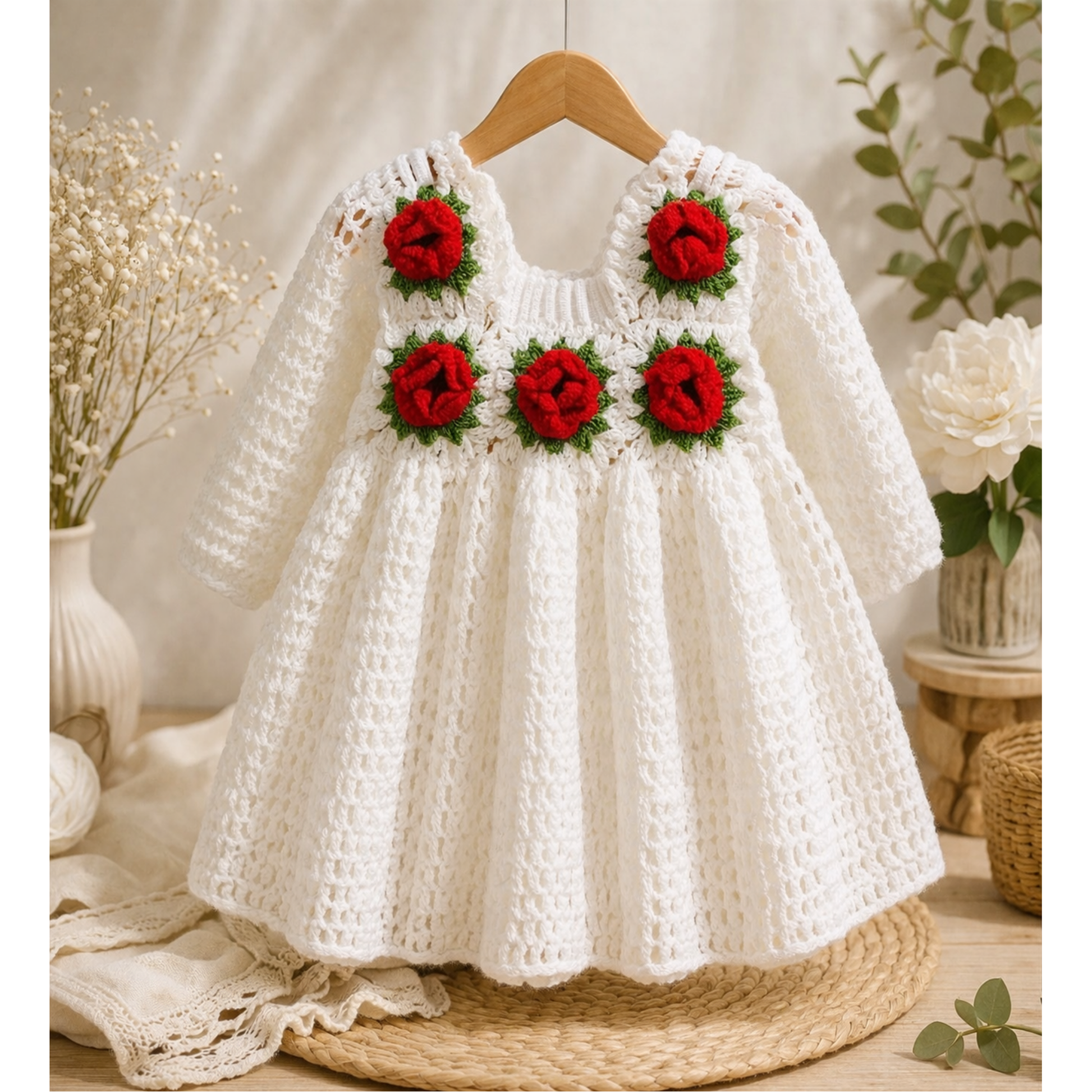 Graceful and timeless, the Ivory Rose Elegance Frock features handcrafted red roses on a soft white base. Limited handmade pieces – each product is crafted with care, not mass-produced.